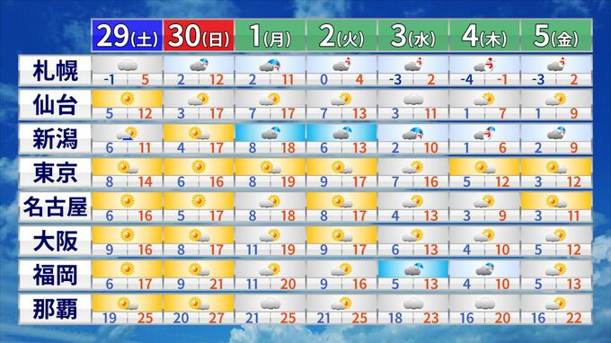 4日を中心に真冬並みの寒さとなる所が多く、札幌では一日を通して気温が0℃以下となる「真冬日」が予想されています。