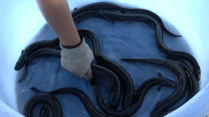 福岡県で最大規模の養鰻業者で、ウナギは、体長15センチほどに成長した「クロコ」と呼ばれる稚魚をフィリピンから輸入し、1年から1年半かけて育てます。