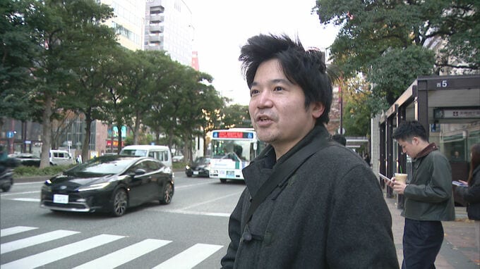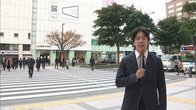 「午前8時過ぎの天神です。風が吹くとより寒く感じられ多くの人がコートやジャケットを着ています」