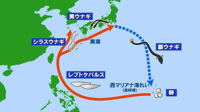 赤ちゃんは、グアムの近くで生まれ、海流に乗って日本近海へ移動し、棒状の稚魚・シラスウナギになります。川で親のウナギに成長したあと、産卵のため再びグアム付近に戻り、その一生を終えます。
