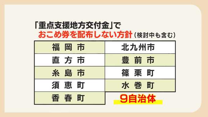 その結果、おこめ券を配布しない方針という自治体は、検討中も含めると、福岡市、北九州市に加え、直方市や豊前市、糸島市など9つ。