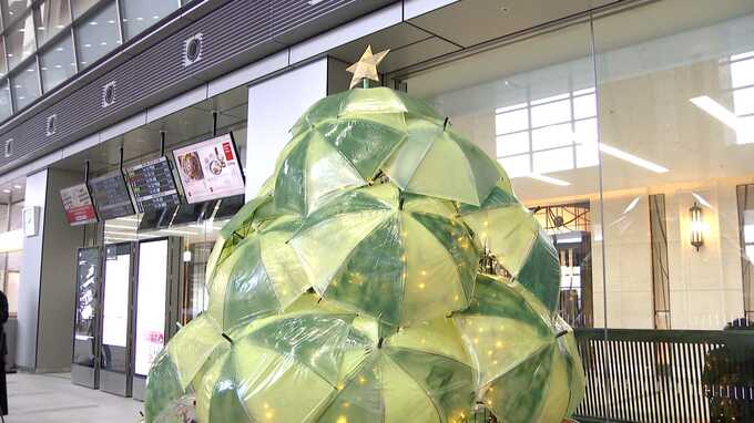 遺失物の中でも特に多いビニール傘は緑色に塗って積み重ねるとこの通り、クリスマスツリーになりました。