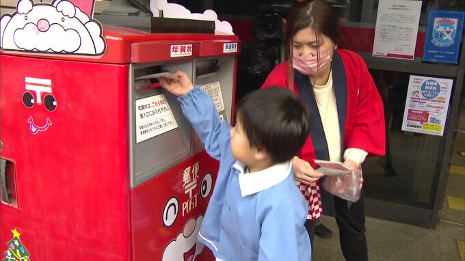 年賀状は今月25日までに出せば、元日に届くことになっています。園児たちは、おじいちゃんやおばあちゃん、友だちに宛てたはがきを早速、投かんしていました。