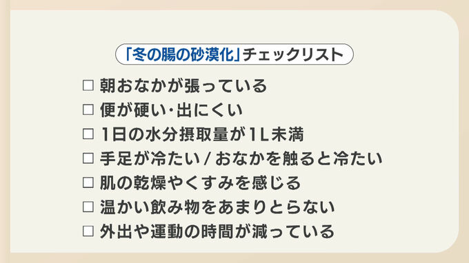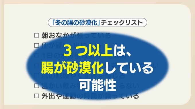 3つ以上当てはまる人は、腸が砂漠化している可能性があるので腸を温めて、朝食を食べたり、歩くなど腸を動かす習慣をこころがけましょう。