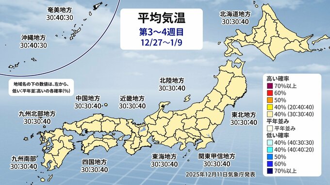 この期間はまだ予測のばらつきが大きいこともあり、全国的に平年と同程度の天候と気温を見込んでいます。