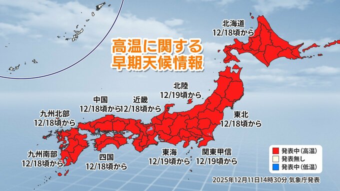 気象庁は、18日(木)頃からは北日本・東日本・西日本で平年よりもかなり気温が高くなるとして「高温に関する早期天候情報」を発表しています。