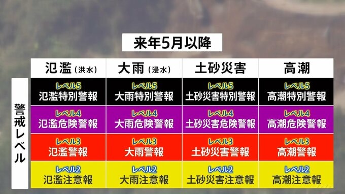 また、警報と特別警報の間には、危険な場所から全員の避難を呼びかけるレベル4の「危険警報」が新たに設けられます。