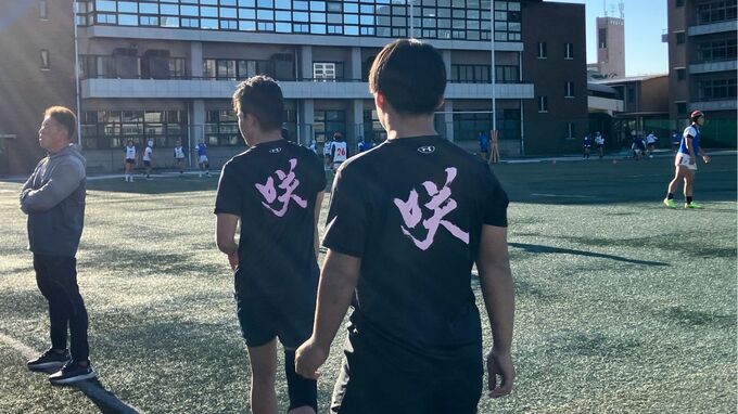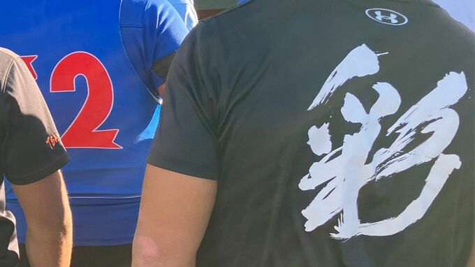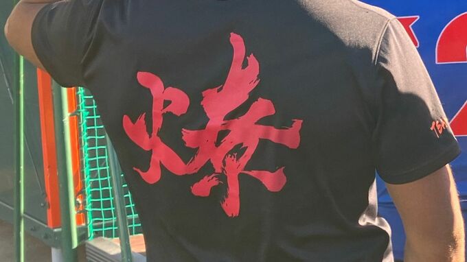 ある選手は、黒いシャツの背中に白い文字で色彩の「彩」=いろどる。