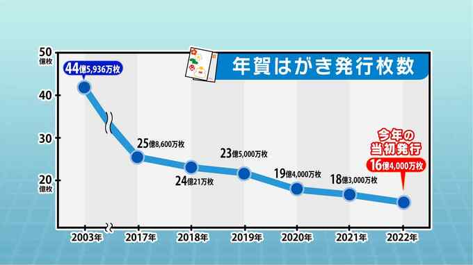 しかし、年賀状を出す人は年々減少しています。発行枚数の推移をみても12年連続で減少、今年は16億4000万枚と2003年のピーク時以降、過去最少となっています。
