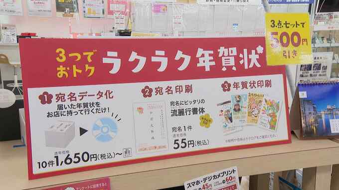 カメラのキタムラが、去年から展開している「ラクラク年賀状」サービス。正月に受け取った年賀状を店に持っていくと、差出人の住所をデータ保存し宛名も裏面も全て印刷して仕上げてくれます。