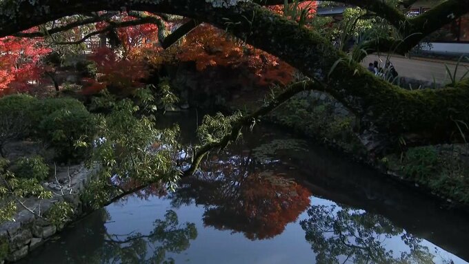 大きな楠などが立ち並ぶ中に、心字池が配置され1100年を超える歴史を感じさせます。
