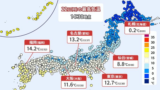 22日は一時的に冬型気圧配置になり、北風が冷たくなっています。