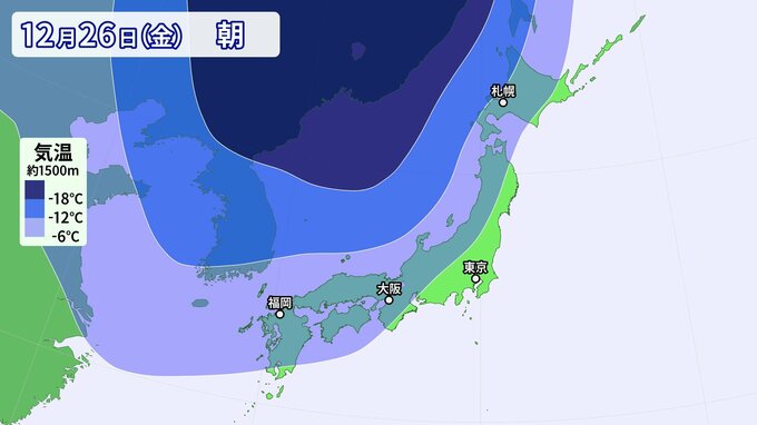25日(木)の夜から西回りで、強い寒気が流れ込み始めて、26日(金)は、上空約1500メートルでマイナス6℃以下(平地で雪の目安)の強い寒気が、本州付近を覆う見込みです。