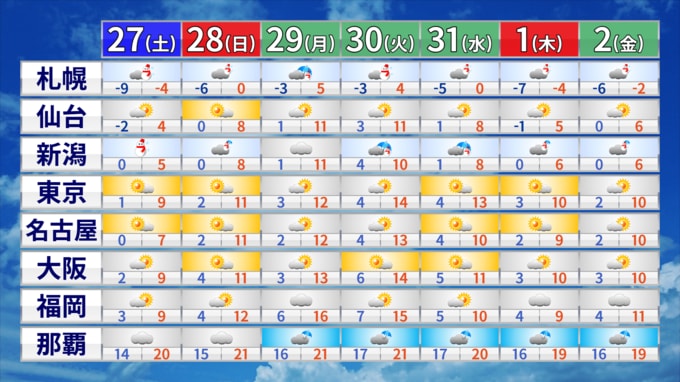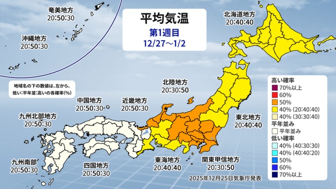 1週目(12月27日~1月2日)の気温は、北日本・東日本は「高温傾向」、西日本・奄美沖縄は「平年並み」となるでしょう。