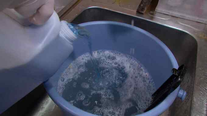 ベアーズ 坂田大樹さん「油汚れや焦げがこびいつくなど頑固な汚れが多いので、アルカリ系の洗剤を使用して油を溶かしながら落としていくという工程」