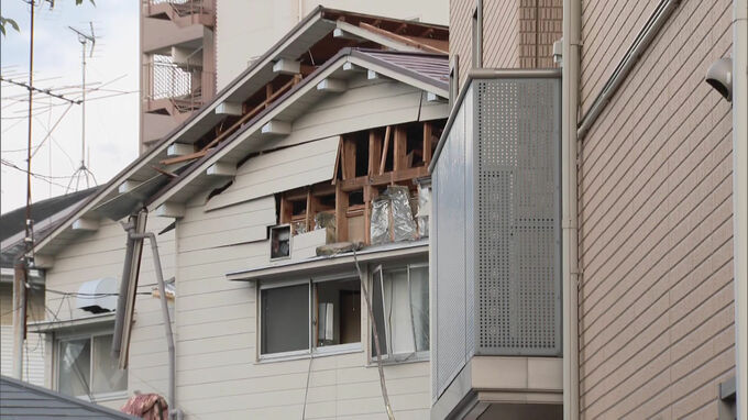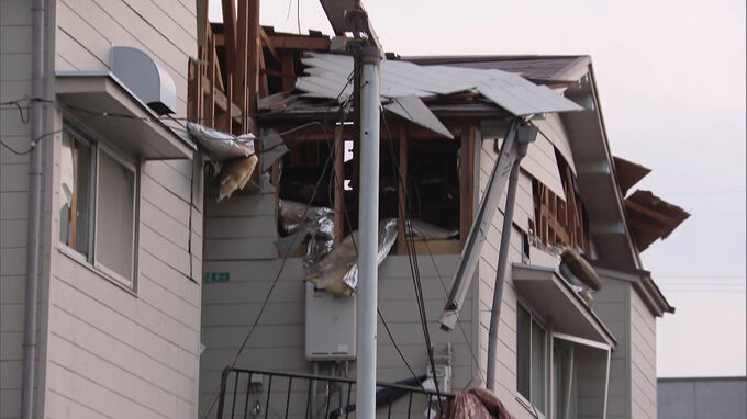 「ガス爆発があったとみられるアパートです。屋根や壁は吹き飛び、窓ガラスが割れているのも確認できます」
