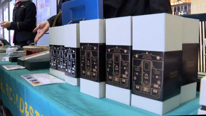 車内限定ボトルの日本酒や焼酎なども並び、多くのファンでにぎわっていました。