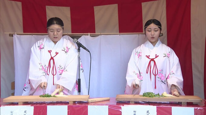 本殿の横では二人の巫女が七草囃子を歌いながらセリやナズナなど七草を包丁で刻む伝統的な姿を披露しました。