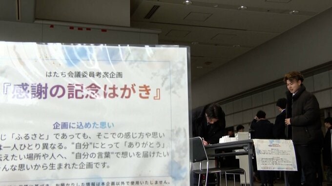 会場にはハガキを書くブースが設けられ、それぞれ大切な人への感謝の思いを綴っていました。