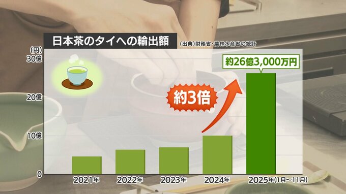 日本茶のタイへの輸出額は、毎年、右肩上がりで、去年は、およそ26億3000万円と、前の年から3倍近くに増え、アジアでは、トップになっています。