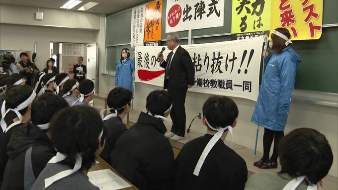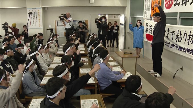 15日午前、小倉北区の北九州予備校で開かれた決起集会には、「必勝」などそれぞれの思いが書かれたはちまきを締めたおよそ400人の受験生が参加しました。