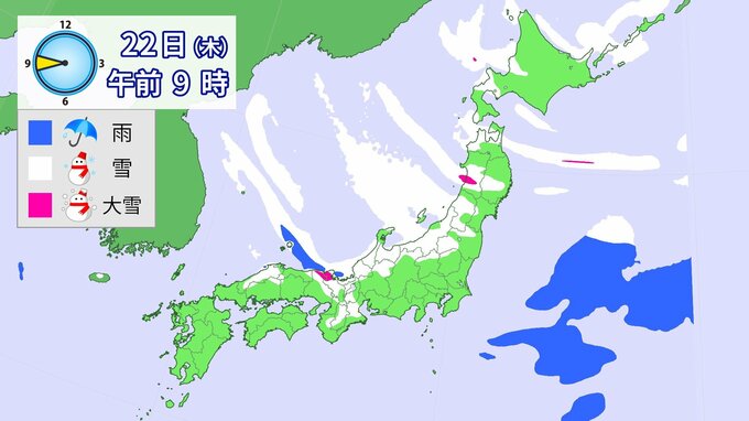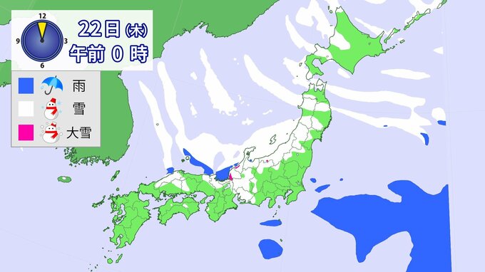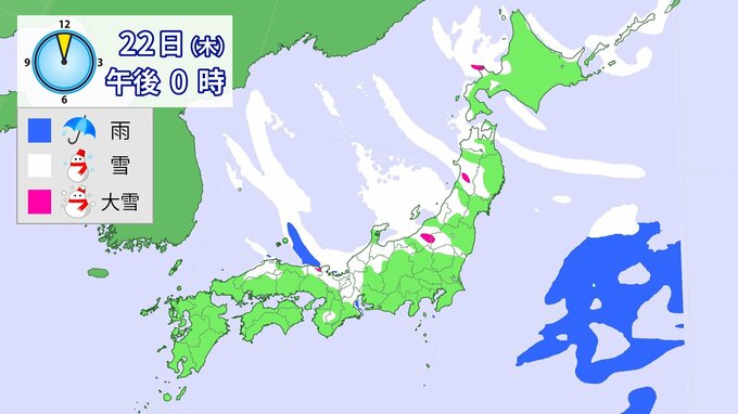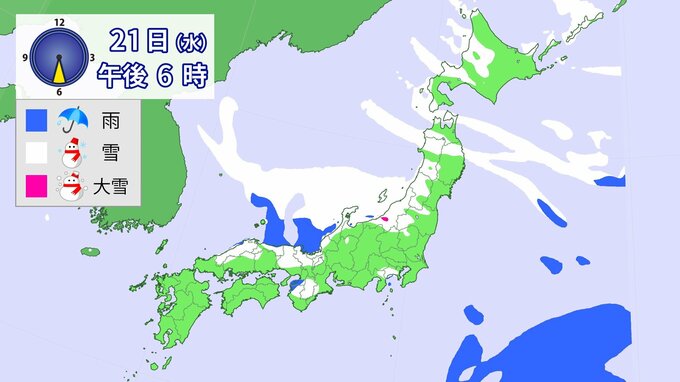 21日午後6時から22日午後6時までに予想される24時間降雪量(多い所)