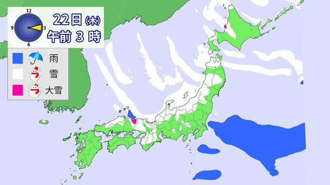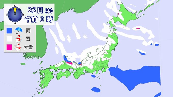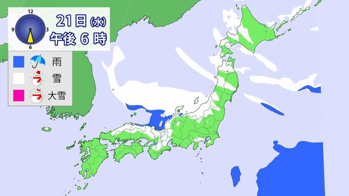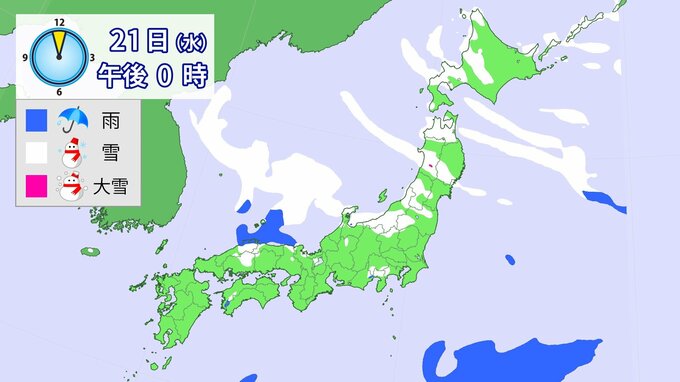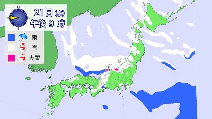 【大雪情報】降雪シミュレーション 1月21日~24日まで 2026年1月21日(水) 10:35 国内 21日午前6時~22日6時までに予想される24時間降雪量(多い所) 北海道地方 50センチ 東北地方 60センチ 関東甲信地方 50センチ 北陸地方 80センチ 東海地方 40センチ 近畿地方 70センチ 中国地方 70センチ