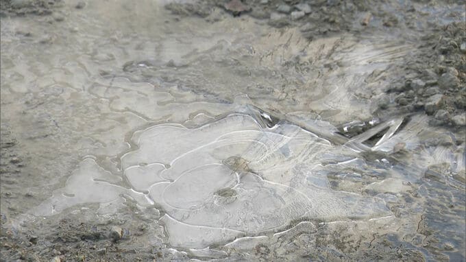 福岡県朝倉市では、22日未明に最低気温がマイナス0.2℃を観測し、水たまりには氷が張っていました。