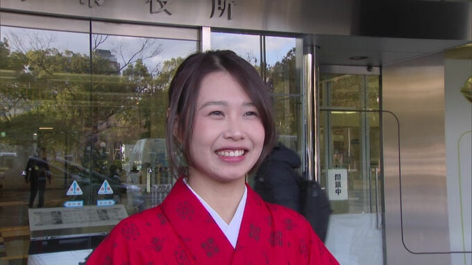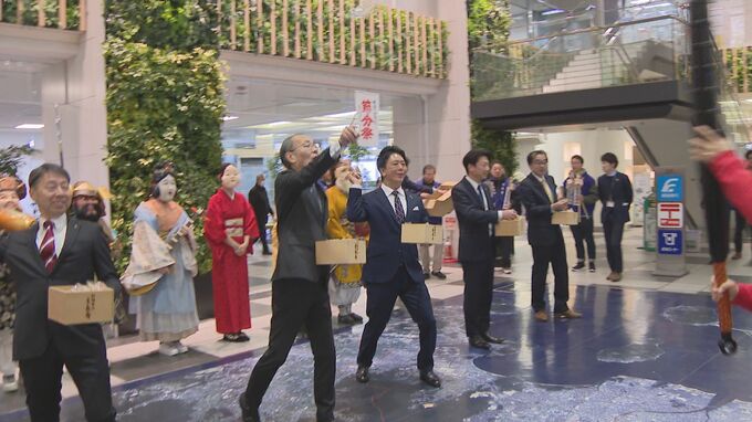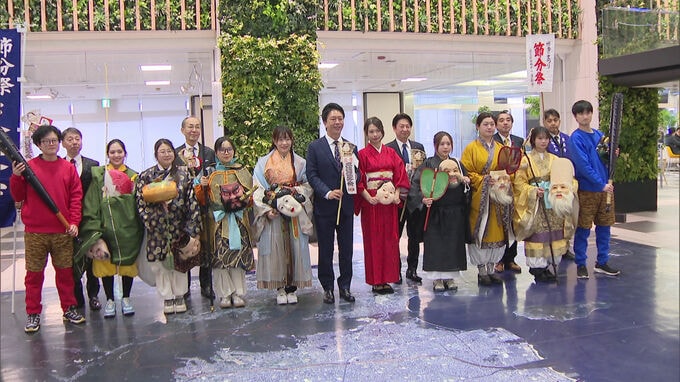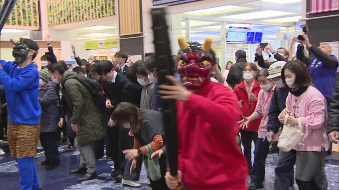 福岡市博多区の東長寺で、節分大祭が開かれるのを前に鬼に扮した留学生たちがきょう福岡市役所で豆まきをしました。