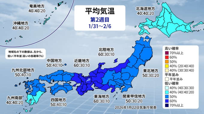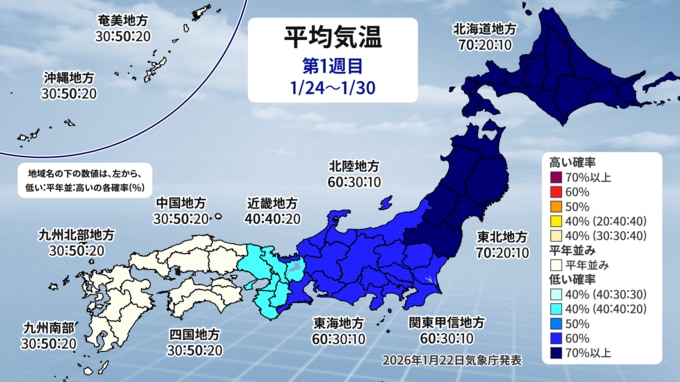 1週目(1月24日~30日)は、北日本・東日本は平年よりも気温が低いでしょう。