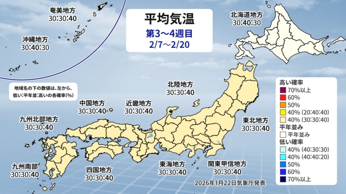 3~4週目(2月7日~20日)頃が厳しい寒さの出口となるでしょう。この頃になると次第に寒気の影響を受ける日が減り、全国的に気温は平年並みになるでしょう。暖かい日と寒い日の気温差が大きくなりそうです。