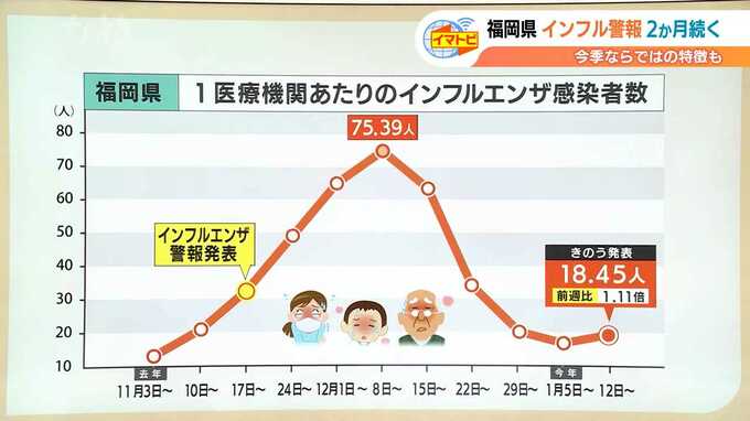 福岡県内の1医療機関あたりのインフルエンザの感染者数は、去年11月中旬ごろにインフルエンザ警報が発表されその後、一気に増加。