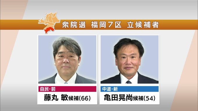 【衆議院選挙】立候補者 福岡選挙区42人 佐賀選挙区5人 2026年1月27日(火) 20:29 国内 暮らし・マネー 福岡7区 福岡7区は自民党の前職、中道改革連合の新人の2人が立候補しています。 【自民・前】藤丸敏 候補(66) 【中道・新】亀田晃尚 候補(54)