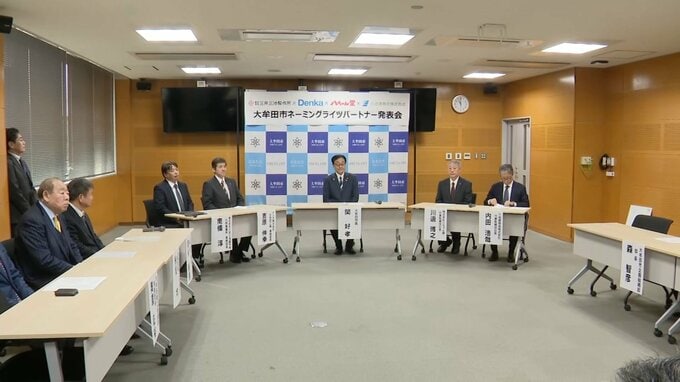 29日午前、大牟田市役所で開かれたネーミングライツパートナーの発表会見。
