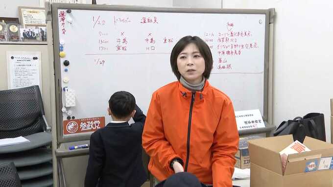 遊説の合間には夫が経営するコンビニの事務所に立ち寄って子供の宿題を見ます。