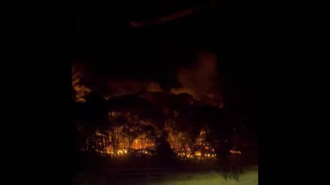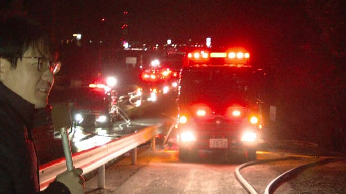 「火事があった現場では、こげくさい臭いがあたり一面に漂っています。道路にはたくさんの消防車が並び消火活動が続けられています」