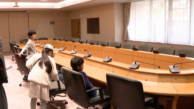 まず子供たちは、春日市議会の会議室や議長室で「議員の椅子」を体験。