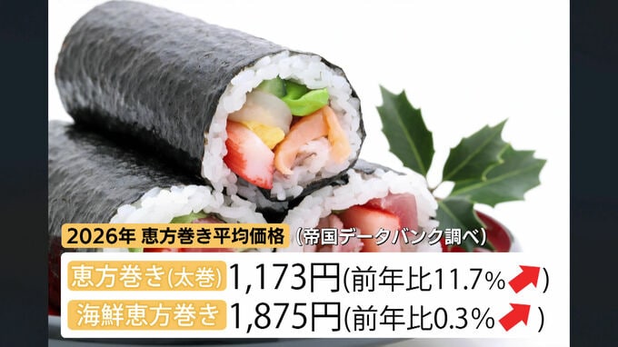 帝国データバンクによりますと、一般的な恵方巻きの平均価格は1173円で、2025年より11.7%値上がり。