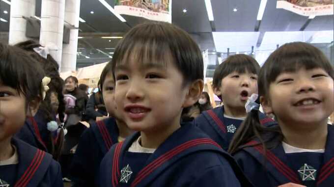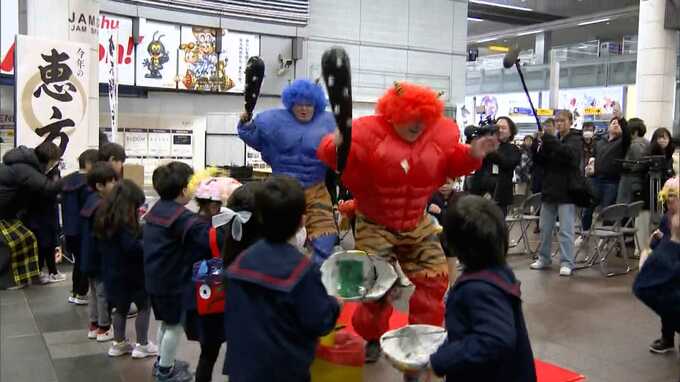 会場では幼稚園児およそ30人が、豆まきをした後振る舞われた恵方巻きを頬張っていました。