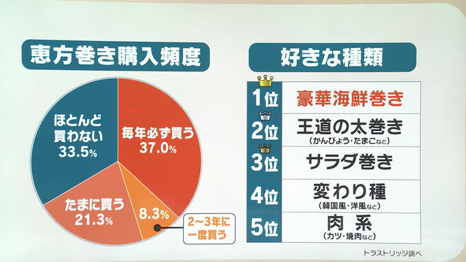 そして、恵方巻きの好きな種類は、「王道の太巻き」「肉系」などありますが、第1位は「豪華海鮮巻」ということです。