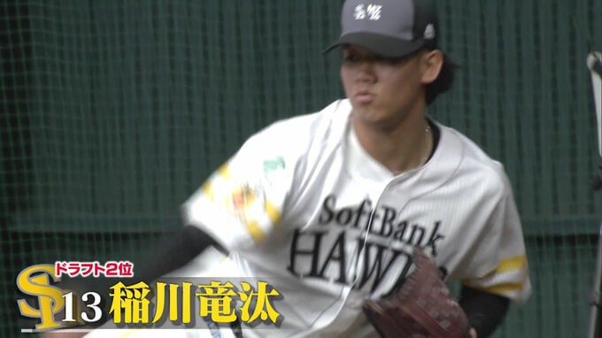 その後は、小久保監督が見つめる中、初めてのブルペン入り。稲川投手はおよそ8割の出力にもかかわらず最速150キロを計測。コーチたちと何度も確認しながら34球を投げ込んだ。