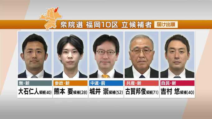 無所属・新人の大石仁人候補(40)、参政・新人の熊本要候補(28)、共産・新人の古賀邦俊候補(71)は伸び悩んでいます。