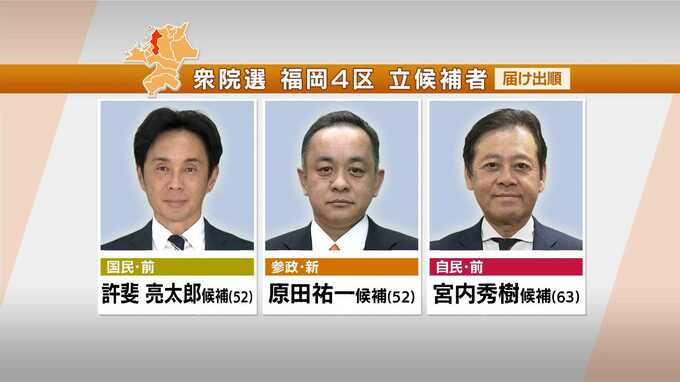 衆議院選挙2026 【衆議院選挙】終盤情勢 福岡選挙区と佐賀選挙区 JNN調査 2026年2月5日(木) 18:18 国内 暮らし・マネー 福岡4区 宗像市や粕屋郡を選挙区とする福岡4区。 前職2人を含む3人の戦いは自民・前職が大きくリードしています。