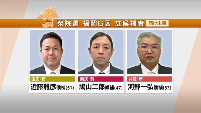 衆議院選挙2026 【衆議院選挙】終盤情勢 福岡選挙区と佐賀選挙区 JNN調査 2026年2月5日(木) 18:18 国内 暮らし・マネー 福岡6区 久留米市などを選挙区とする福岡6区は、自民・前職が新人2人を大きくリードしています。