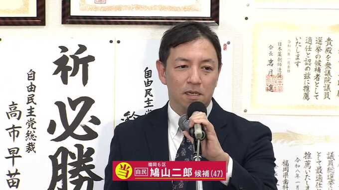 【勝利のことば】福岡6区 自民・鳩山二郎さん(47) To view this video please enable JavaScript, and consider upgrading to a web browser that supports HTML5 video 2026年2月8日(日) 21:08 国内 8日に投票が行われた衆議院選挙で、福岡6区から出馬した自民党の前職・鳩山二郎さん(47)の当選が確実となりました。 鳩山さんの勝利のことばです。 動画でご覧ください。