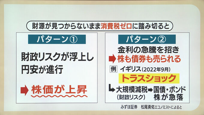 財源が見つからないまま消費税ゼロに踏み切った場合には、財政リスクが浮上することで、かえって円安が進み、株価が上がる可能性もあると話しています。