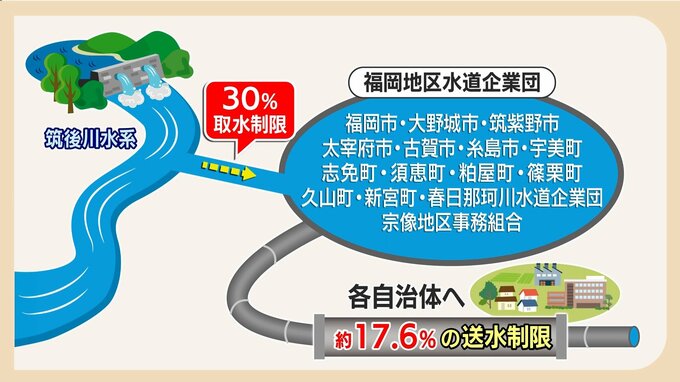 筑後川水系からの取水制限を受けて、1月29日から各自治体への送水を約17.6%制限。