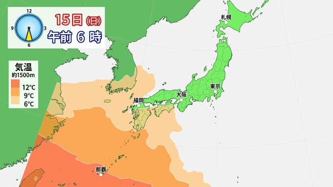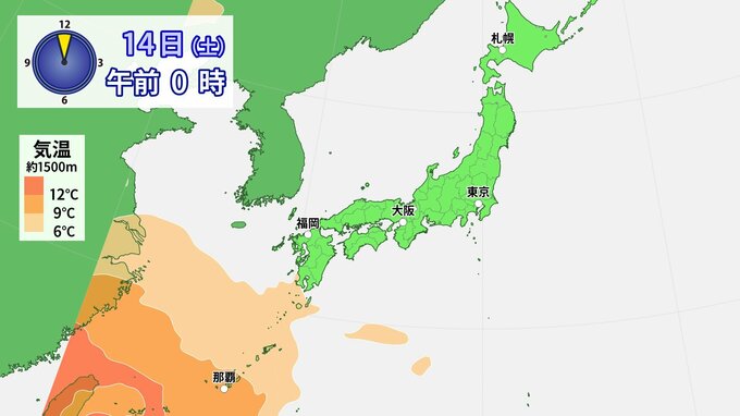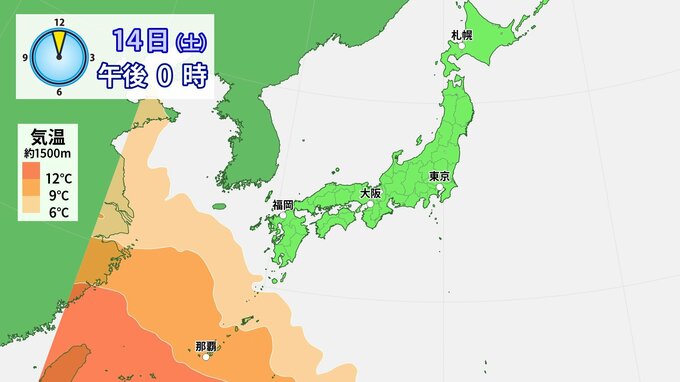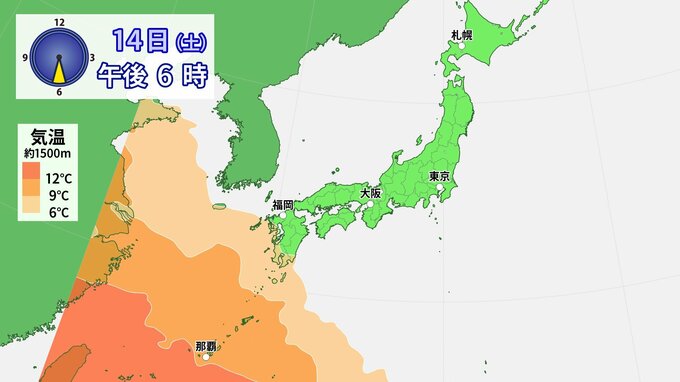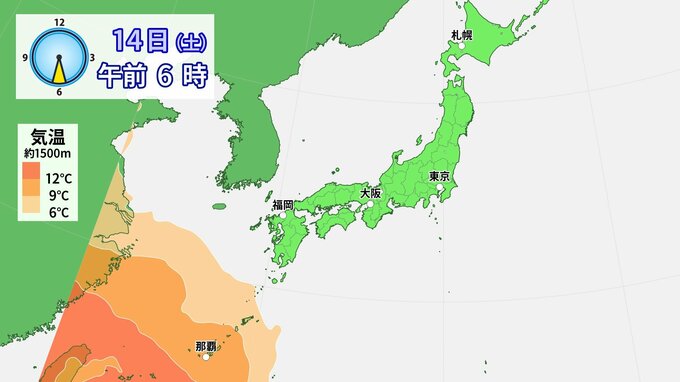 14日(土)~15日(日)は、日本海を発達しながら進む低気圧に向かい南から暖かい空気が流れ込むでしょう。