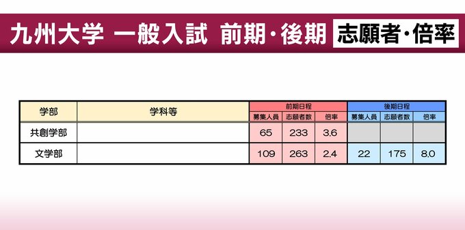【九州大学】一般入試の志願者数・倍率(前・後期) 前期の倍率は文学部2.4倍・法学部2.7倍・経済学部3.2倍・理学部2.4倍・医学部2.1倍・工学部2.0倍・農学部2.9倍 2026年2月13日(金) 17:43 国内 共創学部(前期)3.6倍 文学部(前期)2.4倍