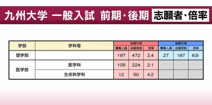 【九州大学】一般入試の志願者数・倍率(前・後期) 前期の倍率は文学部2.4倍・法学部2.7倍・経済学部3.2倍・理学部2.4倍・医学部2.1倍・工学部2.0倍・農学部2.9倍 2026年2月13日(金) 17:43 国内 理学部(前期)2.4倍 医学部医学科(前期)2.1倍 ※理学部の後期日程は各学科ごとに行われます。